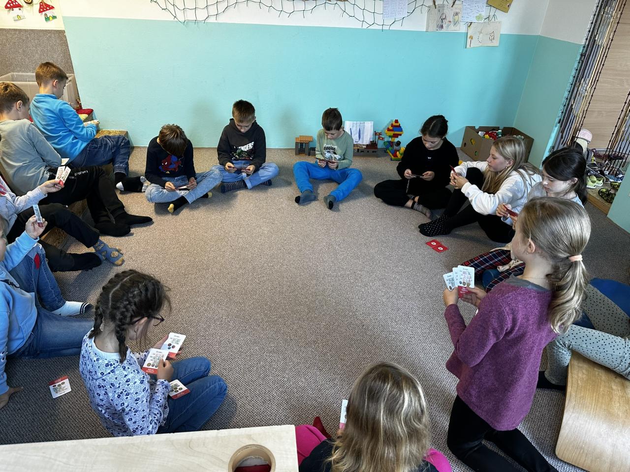 Ve školní družině máme několik společenských her, ale nejvíce nás baví hra s kartičkami, kde musíme počítat peníze. Procvičujeme tím matematiku a zároveň jistou formu finanční gramotnosti. Rádi hrajeme i Mrkanou.