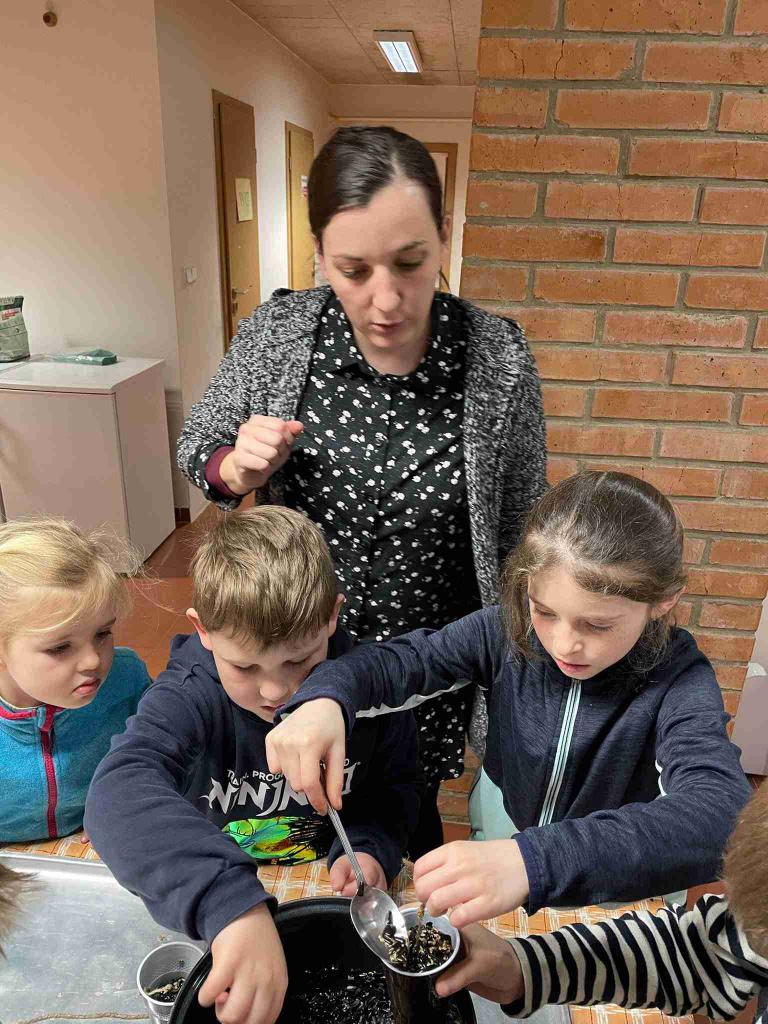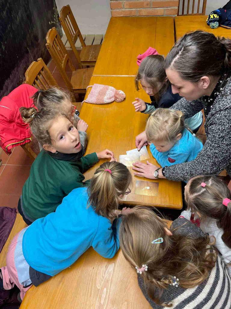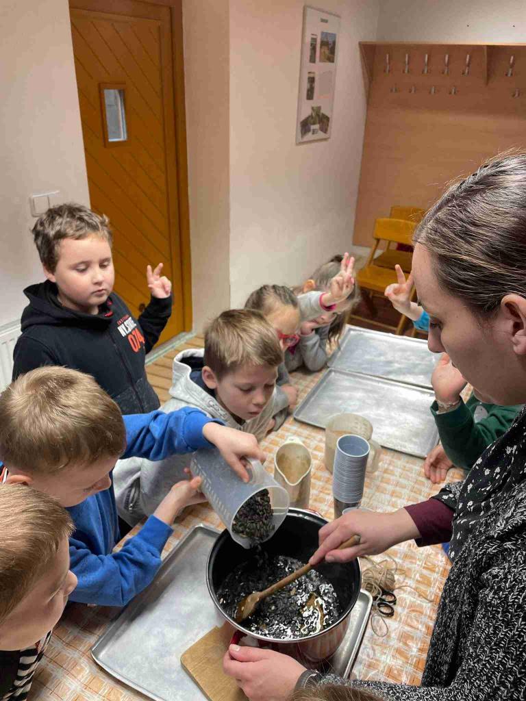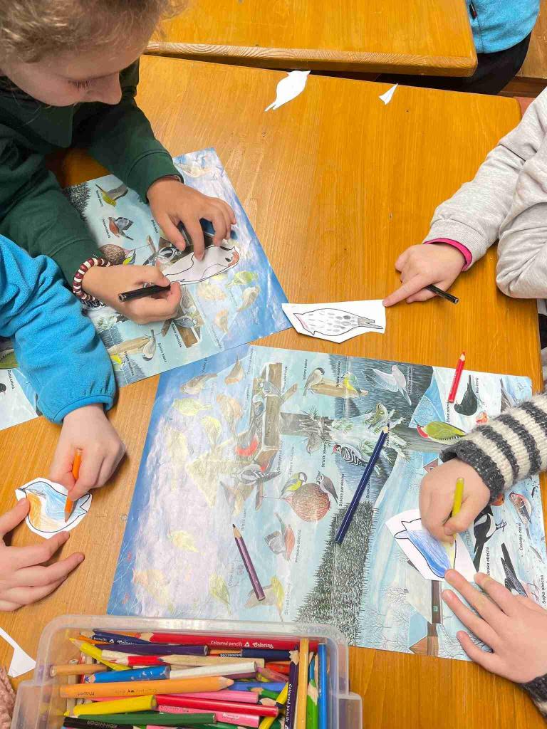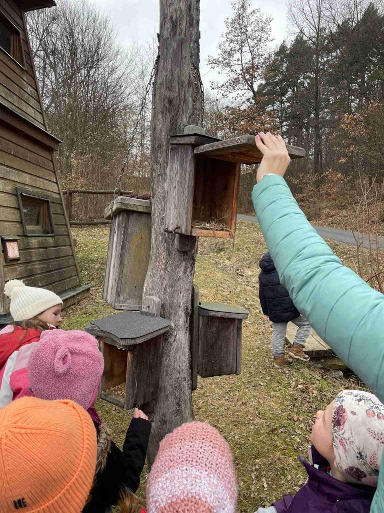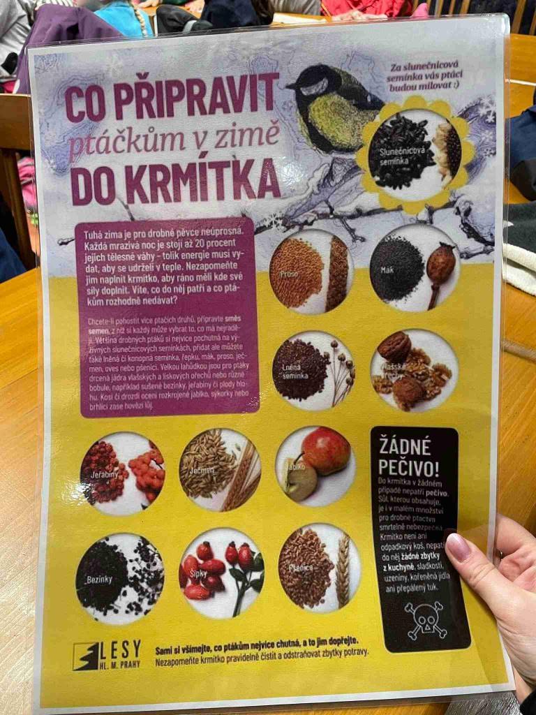 Děti si ve dvojičkách vyrobily krmítka ze semínek a sádla (najdete je před školou u pergoly, pokud je ptáčkové už nevyzobali). Našel se čas i na ptačí malování a na rozloučenou jsme si mohli projít celý statek, pohladili si hrdličku, nahlédli jsme do ptačích budek, poměřili si naše „rozpětí křídel“ a potichoučku obdivovali roztomilá, čerstvě narozená kůzlátka. Nakrmili jsme ovečky a kozy ve výběhu a běželi na autobus, abychom se ve větrném počasí trochu zahřáli. Co nás čeká příště….? Nechte se překvapit :-)