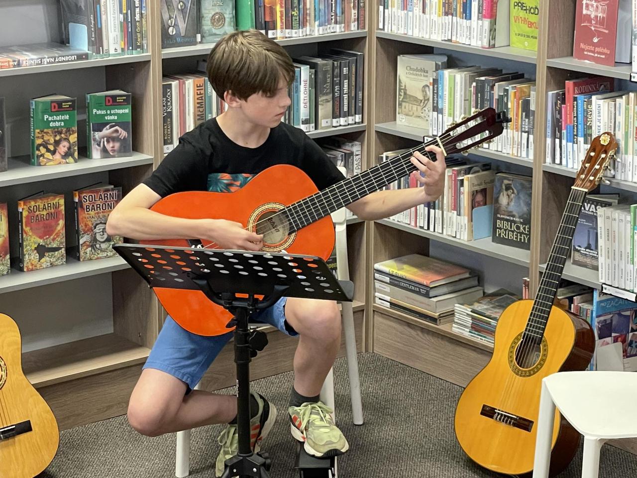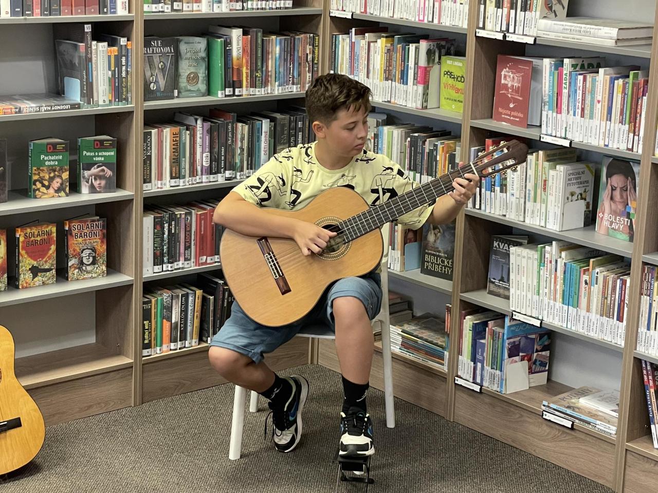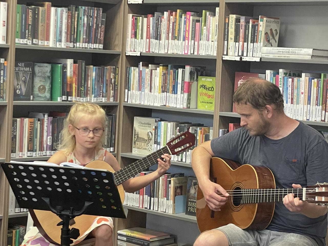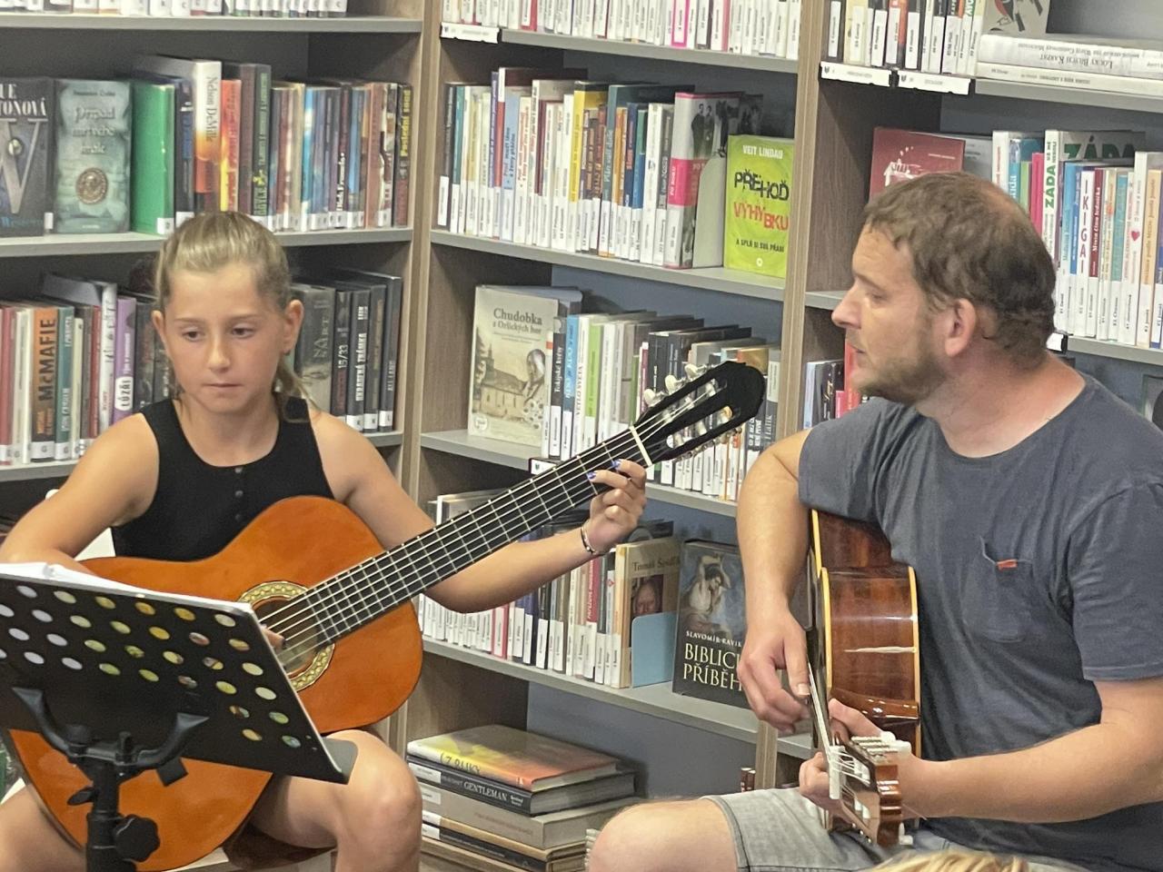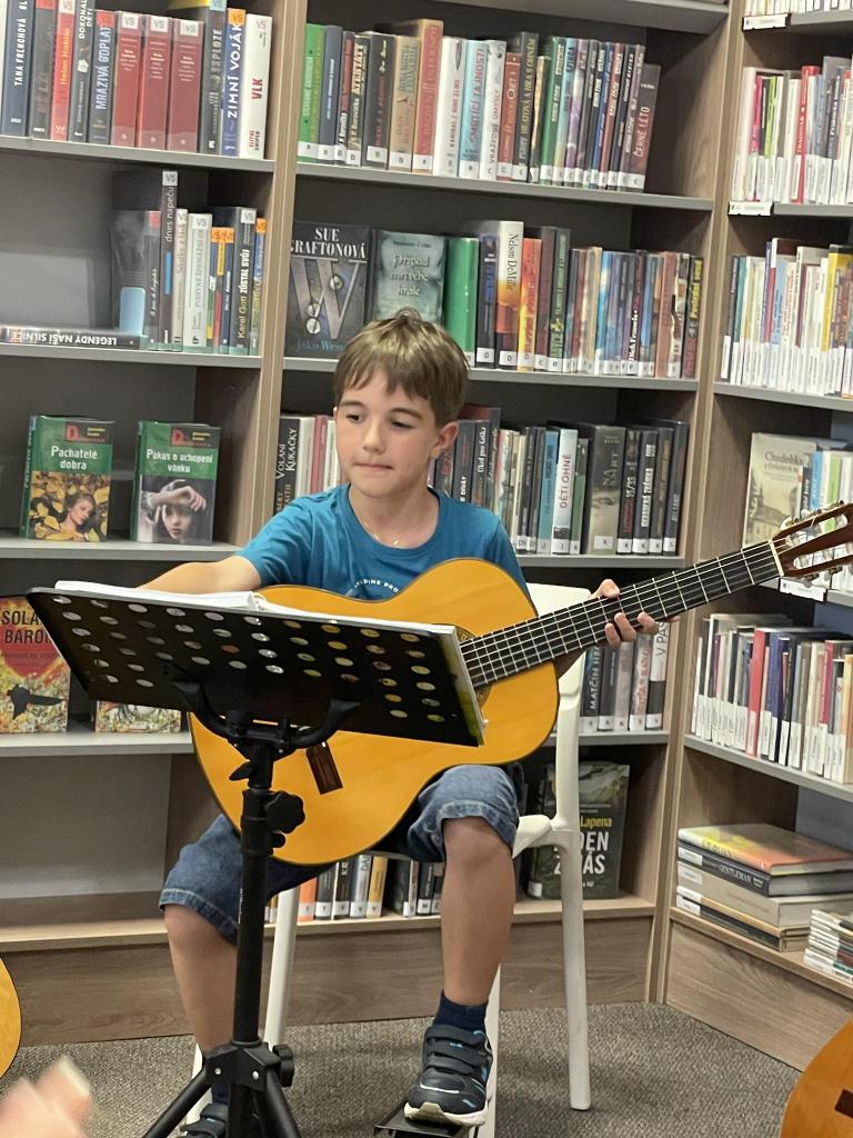 Naši žáci, kteří navštěvují ZUŠ Luhačovice, hudební obor, se pod vedením pana učitele Daniela Burdy předvedli ve hře na kytaru v knihovně v Dolní Lhotě. Publikum velmi potěšily krásné skladby malých i těch zkušenějších kytaristů. Děkujeme za krásný hudební zážitek a přejeme všem našim muzikantům krásné prázdniny.