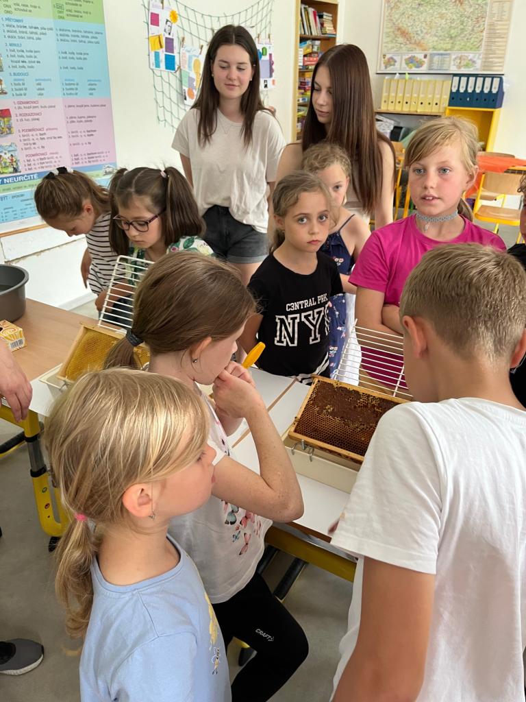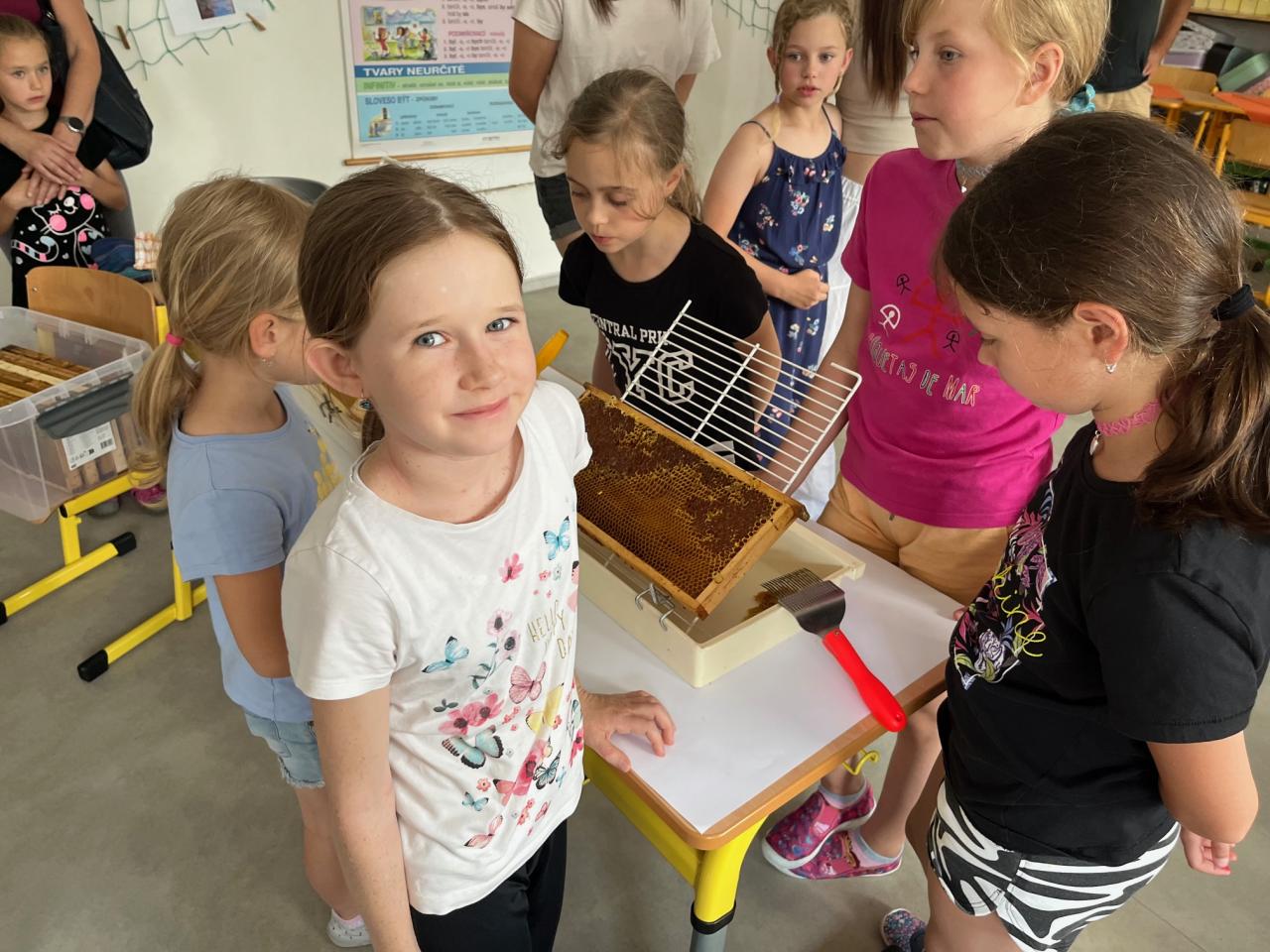 Ve čtvrtek 30. května jsme si mohli přímo ve škole stočit letošní med od včelek ze školních úlů. Velké díky patří především paní Aničce Plešové, která zajistila vše potřebné - připravila pomůcky, přinesla rámečky a hlavně do školy půjčila elektrický přístroj - medomet a ochotně vysvětlovala postup vytáčení medu a zapojovala všechny, kteří si chtěli tuto záslužnou práci vyzkoušet. Dokonce upekla čerstvý domácí chléb, aby si všichni přítomní pak mohli čerstvý med pořádně vychutnat. Podívejte se do fotogalerie, jak se nám vytáčení dařilo.