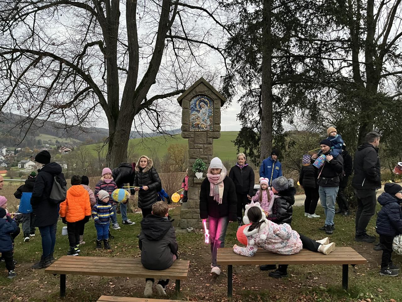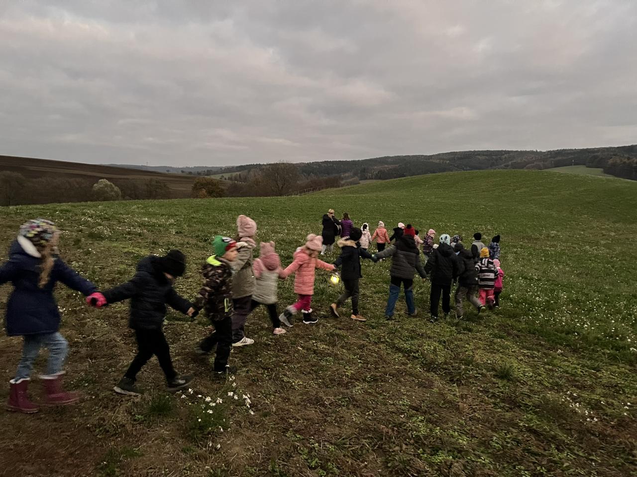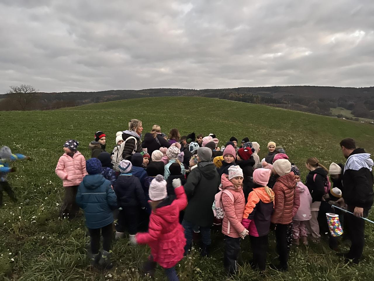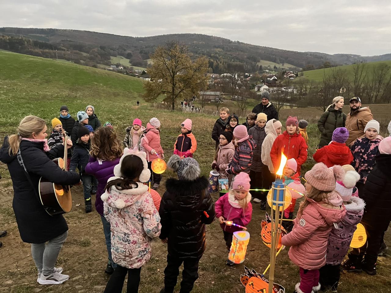 Ještě za světla vyšly děti se svými lampionky a lucerničkami ze tří stran, aby včas dorazili ke kapličce nad Dolní Lhotou. Po zazpívání několika písní o sv. Martinovi se na obzoru skutečně objevil Martin na koni, který se rozdělil o svůj plášť s žebrákem. Jako symbol dobrého skutku se děti také podělily o sladký svatomartinský rohlíček, který našly v ukrytých košíčcích na louce. Poté, již za úplné tmy, se celý průvod světýlek vydal k hasičárně v Dolní Lhotě, kde místní hasičský sbor připravil výborné občerstvení v podobě horkého čaje, svařáku pro rodiče a špekáčků na opékání. V příjemné atmosféře se mnoho účastníků ještě dlouho zdrželo a společně si popovídali. Děkujeme hasičům za toto příjemné zakončení! Více fotek najdete ve fotogalerii.