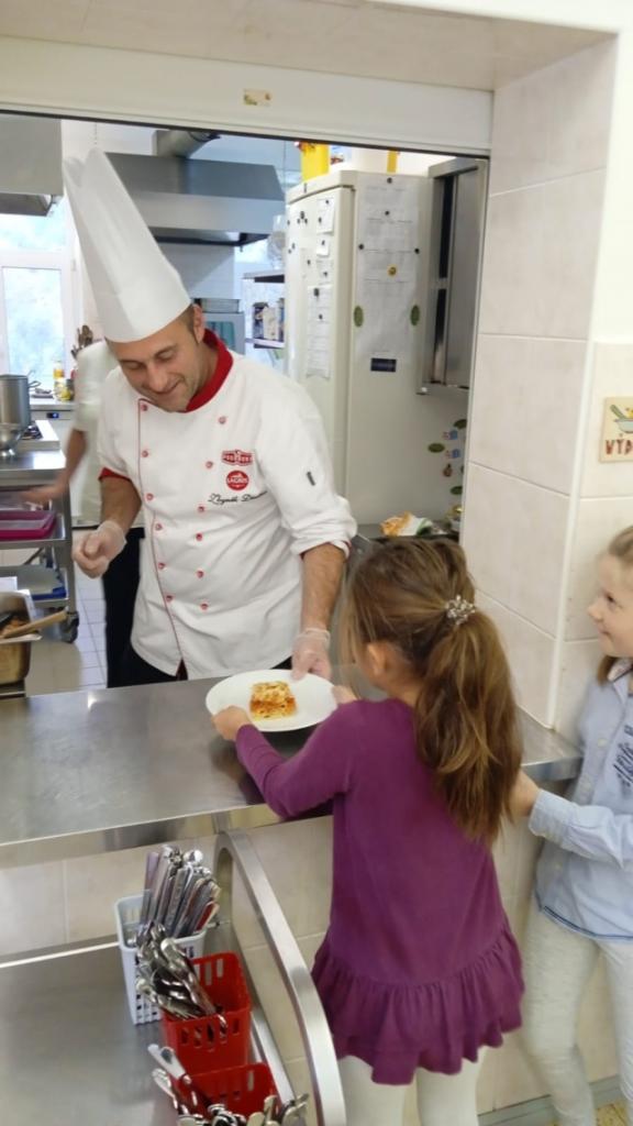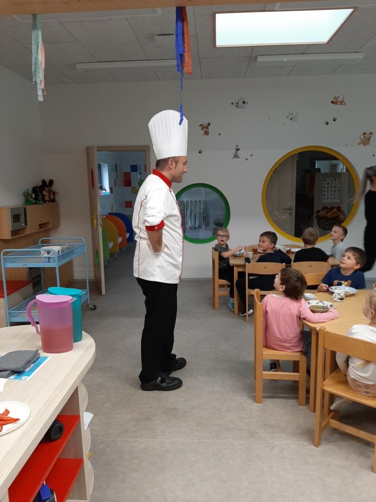 V pátek 14. října nás ve školní jídelně navštívil pan kuchař z firmy Lagris. Nejen že nás poctil svou návštěvou, ale ve spolupráci s naší paní kuchařkou, nám také vykouzlili výtečný oběd. Pan kuchař s vysokou kuchařskou čepicí udělal na děti dojem. Jídlo vydával, seznámil děti s ingrediencemi i postupem, které použili při vaření a nezapomněl jim popřát „dobrou chuť“ :-) Děkujeme za krásný, velmi chutný kulinářský zážitek a budeme se těšit na další :-)