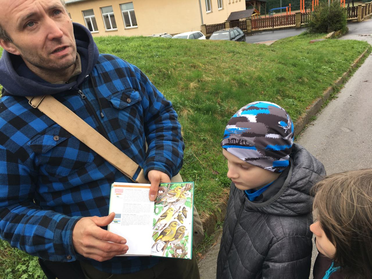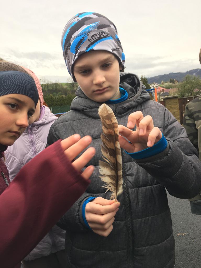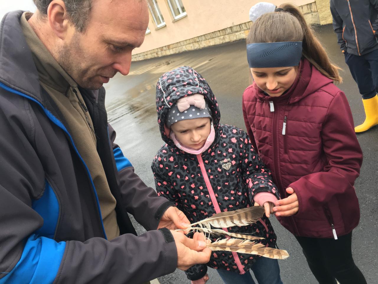 Na úvod dětem představil vhodné publikace, které mohou pomoct při určování ptáčků a co nás velmi zaujalo – i jejich kreslení a zaznamenávání si tak detailů. Ukázal nám pomůcky na kroužkování a popsal, jak taková akce probíhá, tipovali jsme si, komu patří různá peříčka .. a u toho už jsme sledovali nad námi vznášející se ptáky.
