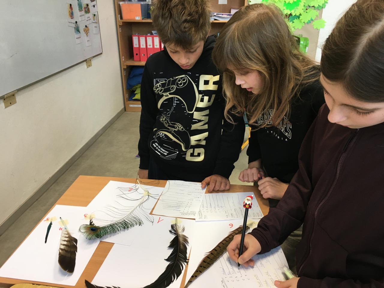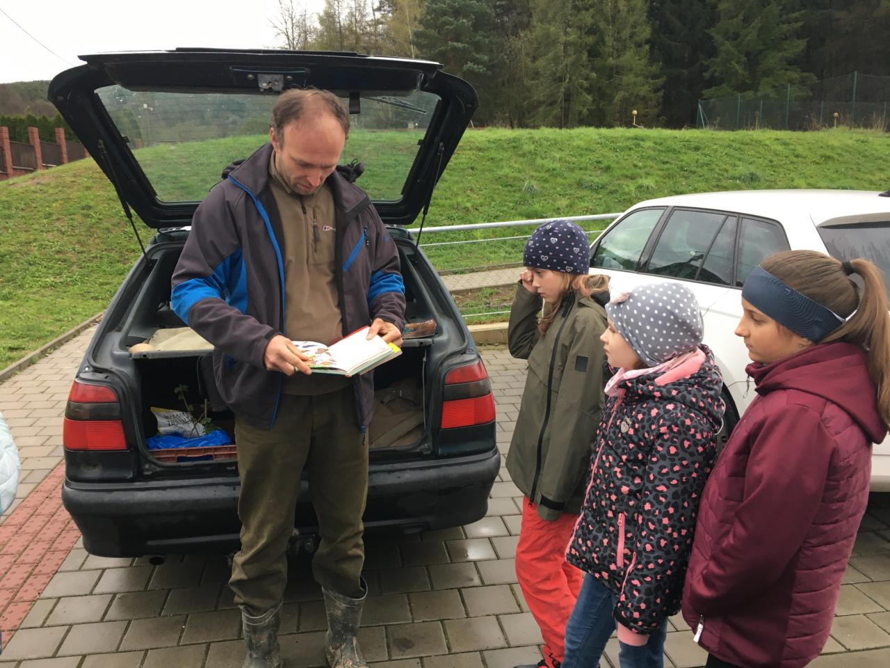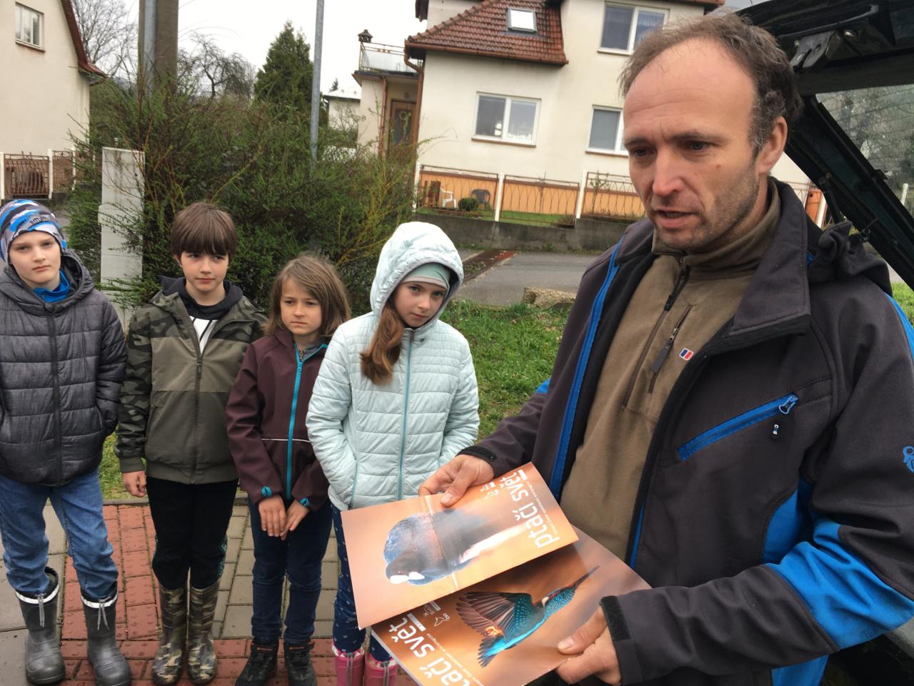 Na úvod dětem představil vhodné publikace, které mohou pomoct při určování ptáčků a co nás velmi zaujalo – i jejich kreslení a zaznamenávání si tak detailů. Ukázal nám pomůcky na kroužkování a popsal, jak taková akce probíhá, tipovali jsme si, komu patří různá peříčka .. a u toho už jsme sledovali nad námi vznášející se ptáky.